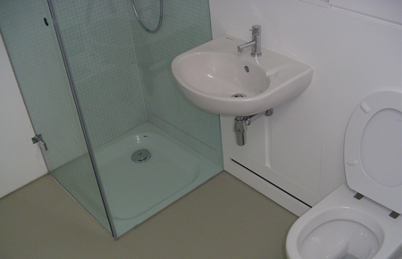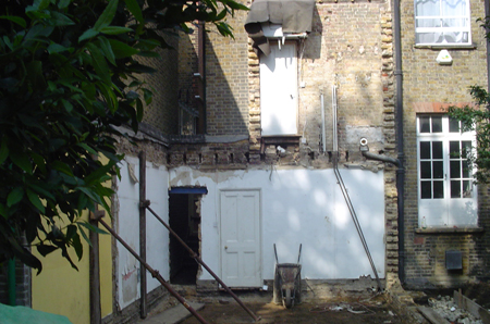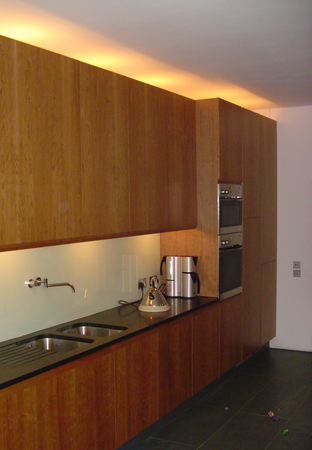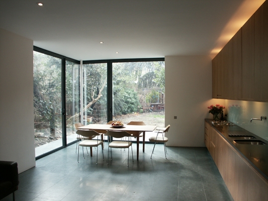 On the ground floor the kitchen/dining room embraces the garden by means of 2.6m high sliding glass doors and a floor of green slate slabs that runs outside at the same level to form a terrace. The kitchen units are finished in red cherry and the counter is honed black slate.