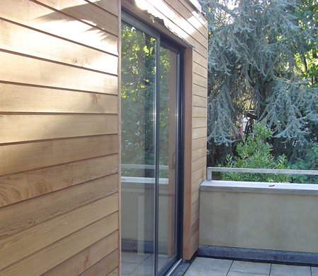 Here we worked closely with the architects to create a simple but striking two-storey extension. The cedar box houses a new family bathroom and a study that can double as a spare room, looking on to the side terrace. A window overlooking the garden has a flush cedar-plank shutter to strengthen the boxe's analogy when the room is not in use.