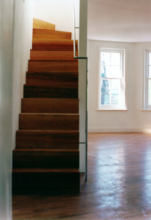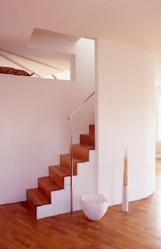 Our job involved converting the entire top floor and loft in to an open plan space, with mezzanine floor access by a spiral staircase, which was incased in a plaster formed cylinder made of piranha pine.